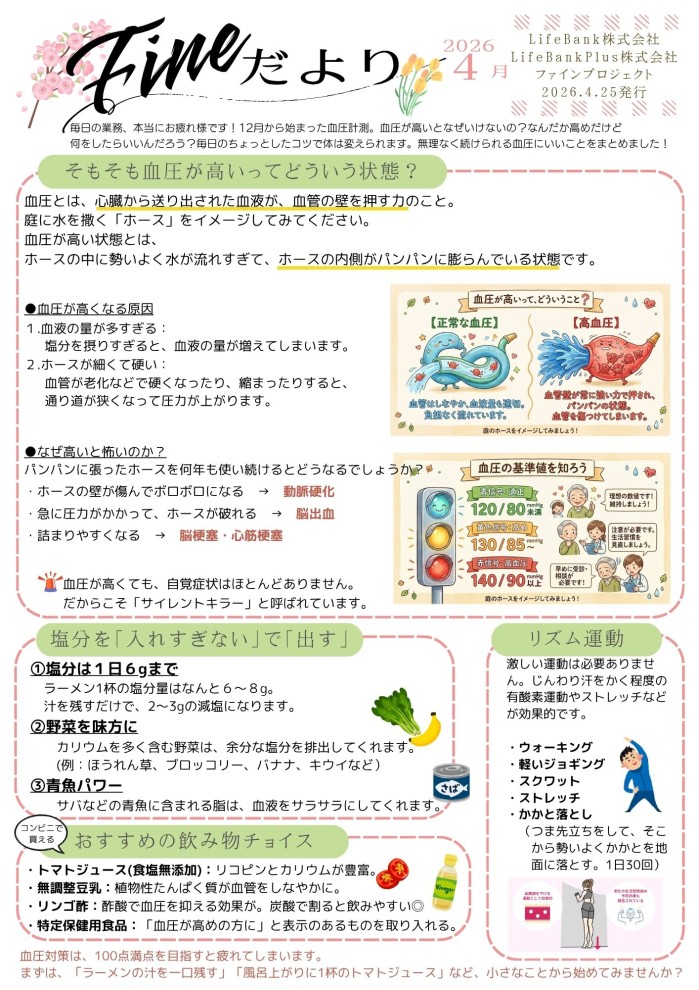 今回のファインだよりは、血圧について基礎知識を掲載しました。